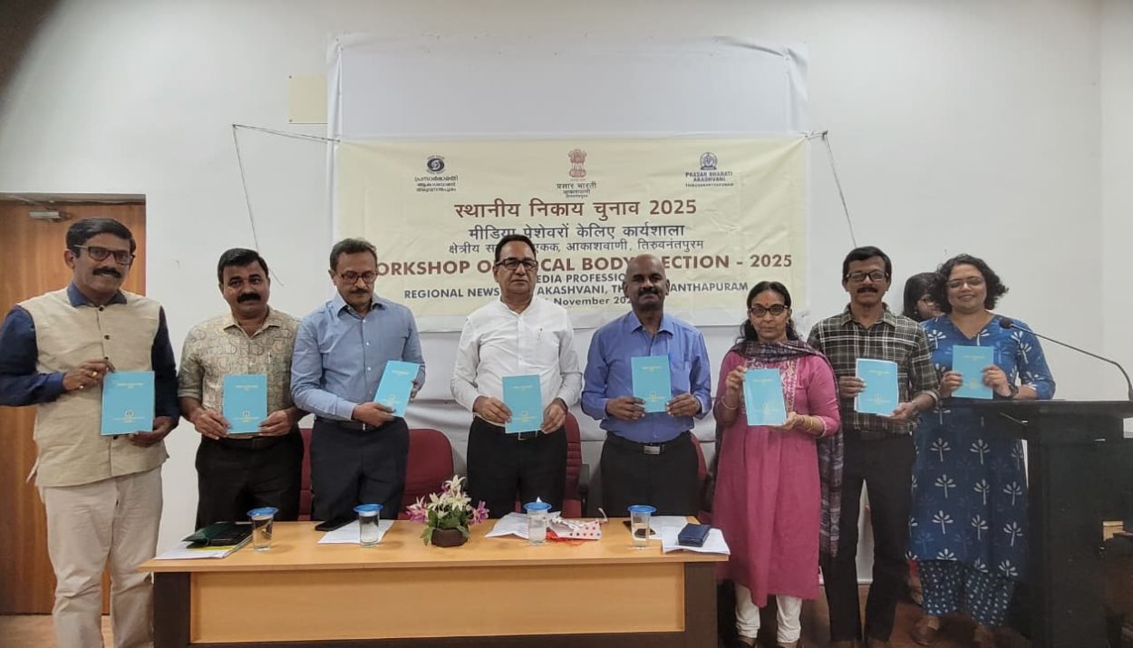 സംസ്ഥാന തെരഞ്ഞെടുപ്പു കമ്മീഷൻ മാധ്യമപ്രവർത്തകർക്കായി തയ്യാറാക്കിയ ഹാൻഡ് ബുക്ക് ശ്രീ. ഷാജഹാൻ പ്രസ് ഇൻഫർമേഷൻ ബ്യൂറോ അഡീഷണൽ ഡയറക്ടർ ജനറൽ വി പളനിച്ചാമി ഐഐഎസിനു നൽകി പ്രകാശനം ചെയ്തു. നിർമിത ബുദ്ധിയുടേതായ ഇക്കാലത്ത് വാർത്തകൾ യാഥാർത്ഥ്യമാണോ എന്നു പരിശോധിക്കുന്നതിന് വളരെ പ്രാധാന്യമാണുള്ളതെന്ന് ചടങ്ങിൽ അധ്യക്ഷത വഹിച്ച പ്രസ് ഇൻഫർമേഷൻ ബ്യൂറോ അഡീഷണൽ ഡയറക്ടർ ജനറൽ വി പളനിച്ചാമി ചൂണ്ടിക്കാട്ടി. ആകാശവാണി വാർത്താ വിഭാഗം മേധാവി ലെമി ജി നായർ, നിലയം മേധാവി എ ജി ബൈജു, പ്രോഗ്രാം വിഭാഗം മേധാവി പി എ ബിജു എന്നിവർ സംസാരിച്ചു. വാർത്താ വിഭാഗം അസിസ്റ്റന്റ് ഡയറക്ടർ എം സ്മിതി സ്വാഗതവും ന്യൂസ് എഡിറ്റർ ബി അനില നന്ദിയും പറഞ്ഞു. തദ്ദേശ ഭരണ സ്ഥാപന തെരഞ്ഞെടുപ്പു നടപടികളെക്കുറിച്ചുള്ള ചർച്ചകൾക്ക് കമ്മീഷൻ സെക്രട്ടറി ബി എസ് പ്രകാശ് നേതൃത്വം നൽകി.