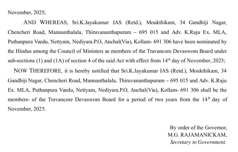 തിരുവിതാംകൂര് ദേവസ്വം ബോര്ഡ് പ്രസിഡന്റായി മുന് ചീഫ് സെക്രട്ടറിയും മുന് ഐഎഎസ് ഉദ്യോഗസ്ഥനുമായ കെ. ജയകുമാറിനെ നിയമിച്ച് സംസ്ഥാന സര്ക്കാര് ഉത്തരവിറക്കി. നവംബര് 14 വെള്ളിയാഴ്ച മുതല് ഉത്തരവ് പ്രാബല്യത്തില് വരും .മുഖ്യമന്ത്രി പിണറായി വിജയന് അടക്കമുള്ളവരുടെ നിര്ദേശപ്രകാരമാണ് ജയകുമാറിനെ സ്ഥാനത്തേക്ക് തിരഞ്ഞെടുത്തത്.രണ്ടുവര്ഷത്തേക്കാണ് നിയമനം. ബോര്ഡ് അംഗമായി മുന് മന്ത്രിയും സിപിഐ നേതാവുമായ കെ. രാജുവിനെയും നിയമിച്ചു. നിലവിലെ ദേവസ്വം ബോര്ഡ് പ്രസിഡന്റ് പി.എസ്. പ്രശാന്തിന്റെയും ബോര്ഡംഗം എ. അജികുമാറിന്റെയും കാലാവധി ഈമാസം 13-ന് അവസാനിക്കും. ട്രാവന്കൂര് കൊച്ചി ഹിന്ദു റിലീജിയസ് ആക്ട് പ്രകാരം മന്ത്രിസഭയിലെ ഹിന്ദു അംഗങ്ങളാണ് ദേവസ്വം ബോര്ഡിലെ പ്രസിഡന്റിനെയും അംഗത്തെയും തിരഞ്ഞെടുക്കേണ്ടത്. അതുപ്രകാരമാണ് മന്ത്രിസഭ ഈ തീരുമാനം കൈക്കൊണ്ടത്. ശബരിമല ക്ഷേത്രത്തിലെ സ്വര്ണമോഷണവുമായി ബന്ധപ്പെട്ട് സര്ക്കാര് പ്രതിരോധത്തിലായ സാഹചര്യത്തിലാണ് പ്രശാന്തിനെ മാറ്റി ജയകുമാറിനെ തലപ്പത്തേക്ക് കൊണ്ടുവന്നത് .