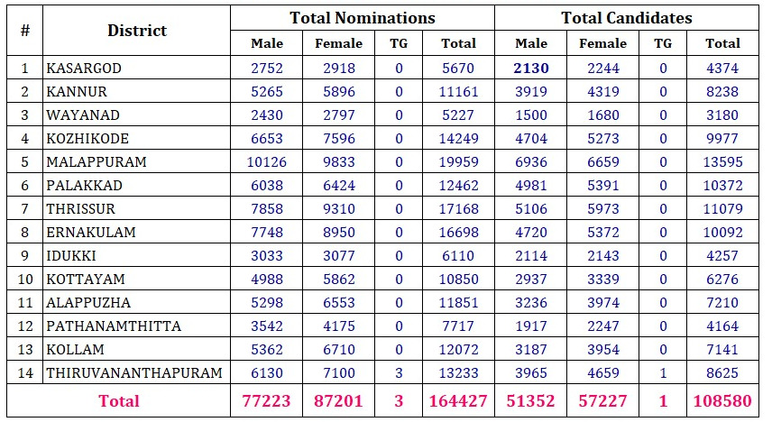 തദ്ദേശസ്വയംഭരണ തിരഞ്ഞെടുപ്പിൽ മത്സരിക്കുന്നതിനുവേണ്ടി സമർപ്പിച്ചിട്ടുള്ള നാമനിർദ്ദേശപത്രികകളുടെ സൂക്ഷ്മപരിശോധന നവം. 22ന് രാവിലെ 10 മുതൽ ആരംഭിക്കും.