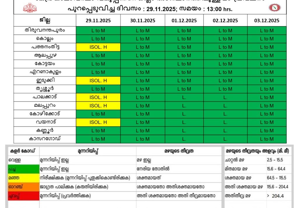 ഒറ്റപ്പെട്ട ശക്തമായ മഴയ്ക്കുള്ള സാധ്യതയാണ് പ്രവചിക്കപ്പെട്ടിരിക്കുന്നത്. 24 മണിക്കൂറിൽ 64.5 മില്ലിമീറ്റർ മുതൽ 115.5 മില്ലിമീറ്റർ വരെ മഴ ലഭിക്കുന്ന സാഹചര്യത്തെയാണ് ശക്തമായ മഴ എന്നത് കൊണ്ട് അർത്ഥമാക്കുന്നത്.