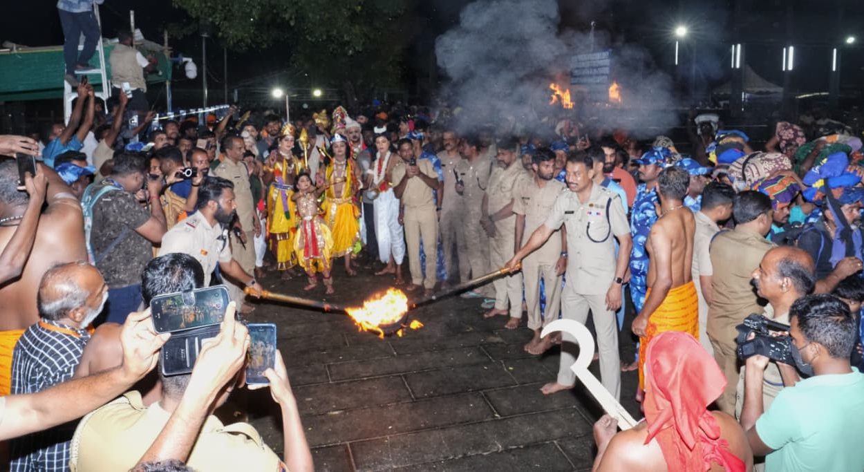 ദീപാരാധനയ്ക്കുശേഷം കൊടിമരത്തിന് മുന്നിൽനിന്നു ക്ഷേത്രം തന്ത്രി കണ്ഠര് മഹേഷ് മോഹനരും മേൽശാന്തി ഇ.ഡി. പ്രസാദ് നമ്പൂതിരിയും ചേർന്ന് കർപ്പൂരാഴിയ്ക്ക് അഗ്നി പകർന്നു തുടക്കം കുറിച്ചു. ഘോഷയാത്ര ഫ്ളൈ ഓവർ കടന്നു മാളികപ്പുറം ക്ഷേത്രസന്നിധിവഴി നടപ്പന്തലിൽ വലം വച്ചു പതിനെട്ടാംപടിയ്ക്കു മുന്നിലാണ് സമാപിച്ചത്.