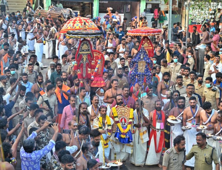Ambalapuzha and Alangad groups march through the Sheeveli procession with devotion