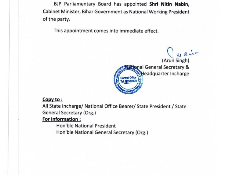 ബിജെപിയുടെ  ദേശീയ വര്‍ക്കിംഗ് പ്രസിഡന്റായി നിതിന്‍ നബീനെ നിയമിച്ചു